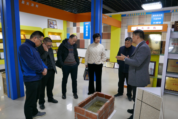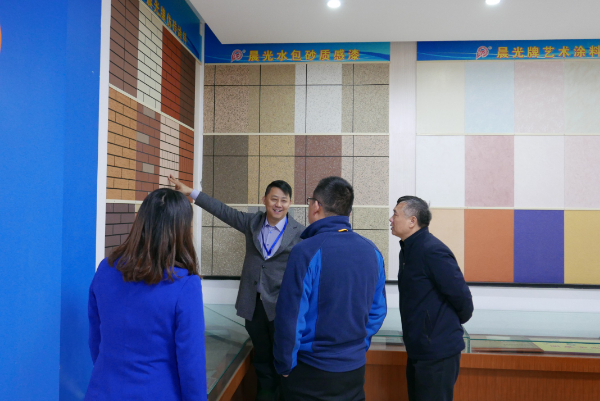 在产品展示厅,薛亚波总经理向来宾介绍了JN体育三十多年因技术沉淀所创新的的各种高技术产品,包括:真石漆、水包砂、智能调光玻璃、隔热涂料、CHG建筑用涂装节能系统、柔性无机全能陶瓷水漆等。
