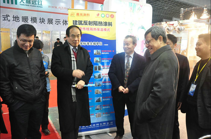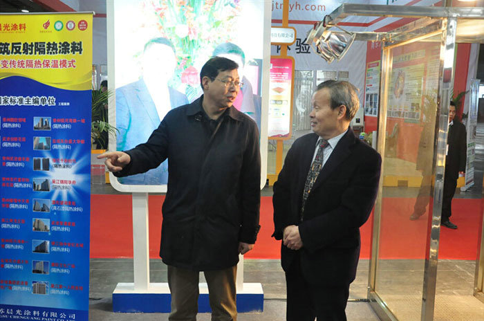 国家住房和城乡建设部科技与产业发展司,江苏省墙体改革办公室12月19~21日在中国南京国际展览馆主办了中心城市2014首届夏热冬冷地区绿色建材展览会,原建设部党组成员,副部长,现全国节能协会会长郑坤生,住建部科技产业司韩司长,江苏省住建厅黄处长,南京市墙改办等领导到会祝贺,由江苏JN体育涂料有限公司发明的建筑反射隔热涂料保温系统在开幕式当天受到了郑坤生部长等领导的参观视察。