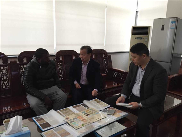 2015年12月12日。广交会非洲刚果客商费先生,专程来我公司,就双方在涂料领域的战略合作事宜,进行了深入商谈,参加本次商谈的有江苏JN体育涂料有限公司董事长缪国元以及总经理薛亚波。