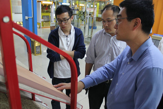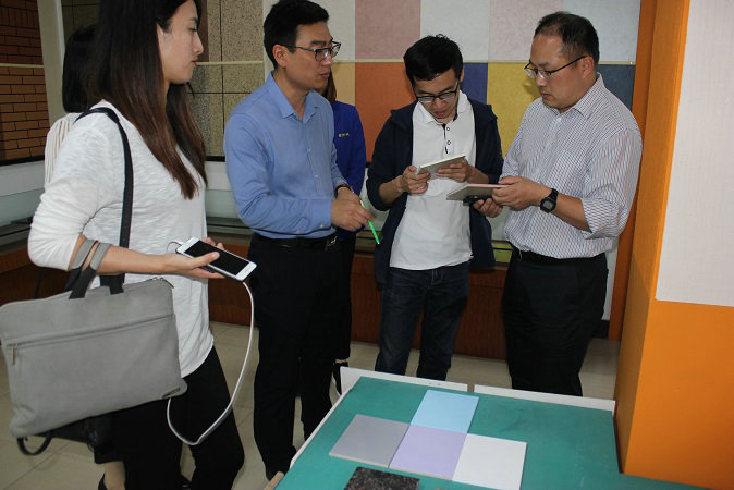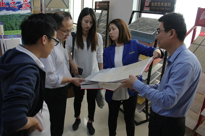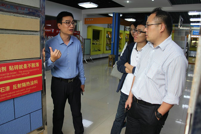 在产品展示厅,吴总亲自向考察团介绍了水包砂多彩石、智能变色调光膜、瓷砖粘结剂、超薄型防水涂料等多样产品,以多样的具有科技含金量的创新产品,展示JN体育所具有的科研实力,受到了碧桂园考察团的高度认可。