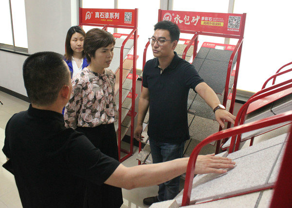 JN体育中禾科技总经理吴建接待了考察团,带领他们全面了解了JN体育涂料各系列产品:水包砂多彩石、智能变色调光膜、瓷砖粘结剂、超薄防水涂料等等。JN体育涂料一直致力于科技创新,这些系列产品在JN体育博士后工作站的手中不断更新升级,紧跟时代潮流,保持着市场的领先地位。