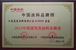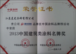 8月27日,“2013中国涂料品牌榜”揭晓。江苏JN体育涂料有限公司凭借在品牌知名度、创新力等方面的优秀表现,一举斩获中国建筑类涂料名牌奖这项大奖。图为江苏JN体育涂料有限公司此次颁奖获得的荣誉证书。